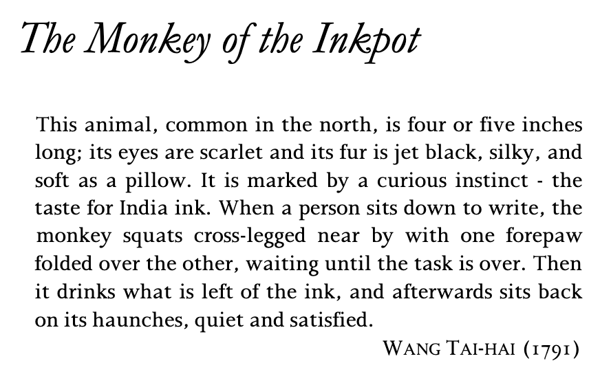 On a related note, I recently discovered this amusing snippet in The Book of Imaginary Beings (1969) by Jorge Luis Borges and Margarita Guerrero. Now I like to imagine I keep writing to prevent the monkey from drinking whatever is left of the ink…