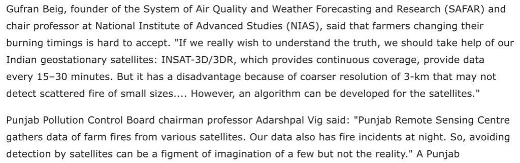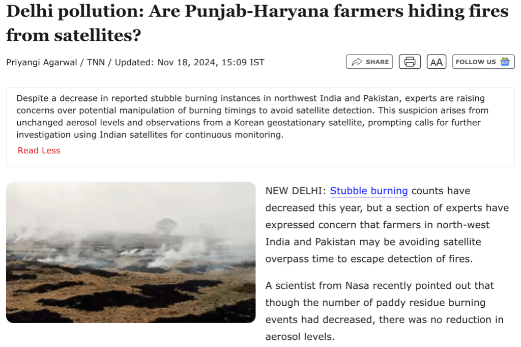 The idea that farmers across the many paddy-growing states in North India collectively decided to postpone their fires to keep them out of the satellites' sight seems preposterous. The The Times of India article has some experts towards the end saying this…